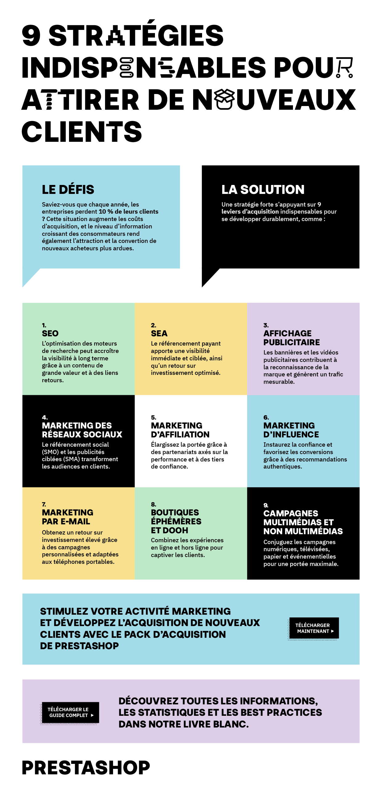 Dans un contexte de plus en plus concurrentiel, complexifié par un coût d’acquisition qui s’envole, comment construire une stratégie pertinente ? Pour y répondre, PrestaShop vous propose, au travers de ce livre blanc, d’étudier 9 leviers d’acquisition pour faire venir des prospects sur votre boutique en ligne, et conquérir efficacement de nouveaux clients.